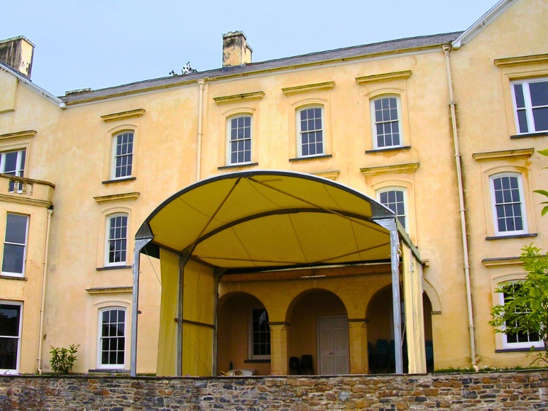 To protect the space outside the triple archway doors at the rear of the house, we installed a canopy in sand shade PVC. The colour and profile keep a low visual impact while providing dependable cover in keeping with the lovingly restored setting.