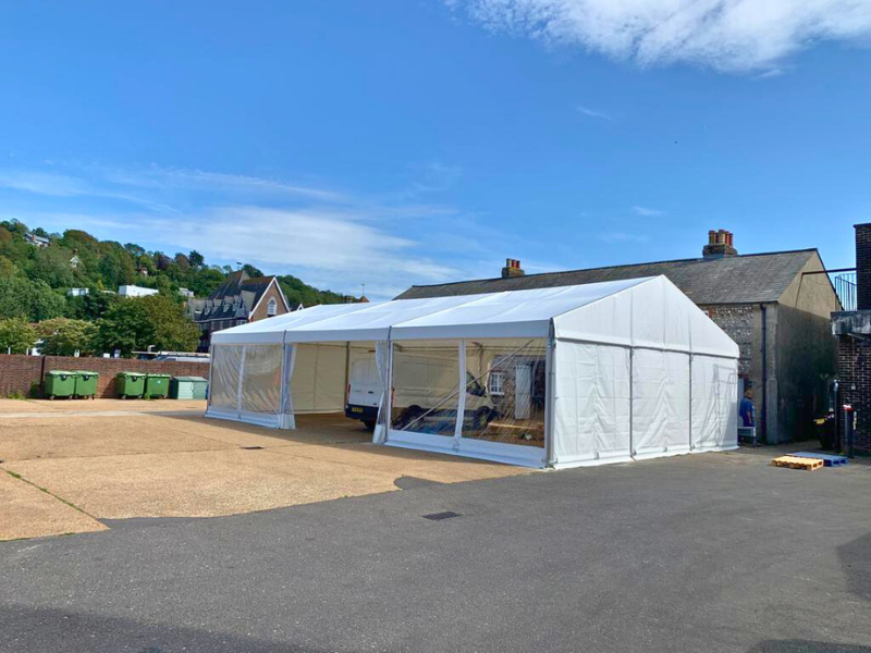 Following our site inspection, solutions were proposed and our Hampshire Structures Series 120 was selected. With 5m bays and a 2.487m side height, our 9m x 20m aluminium frame marquee structure was created with durable PVC covers in Verseidag DURASKIN™.