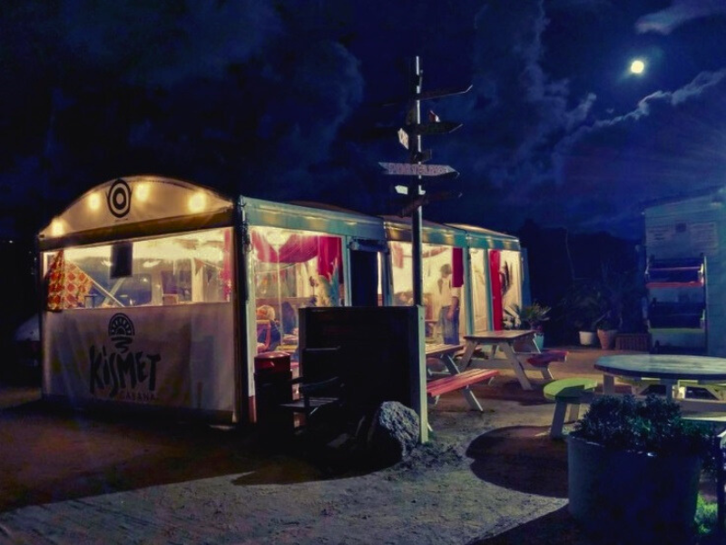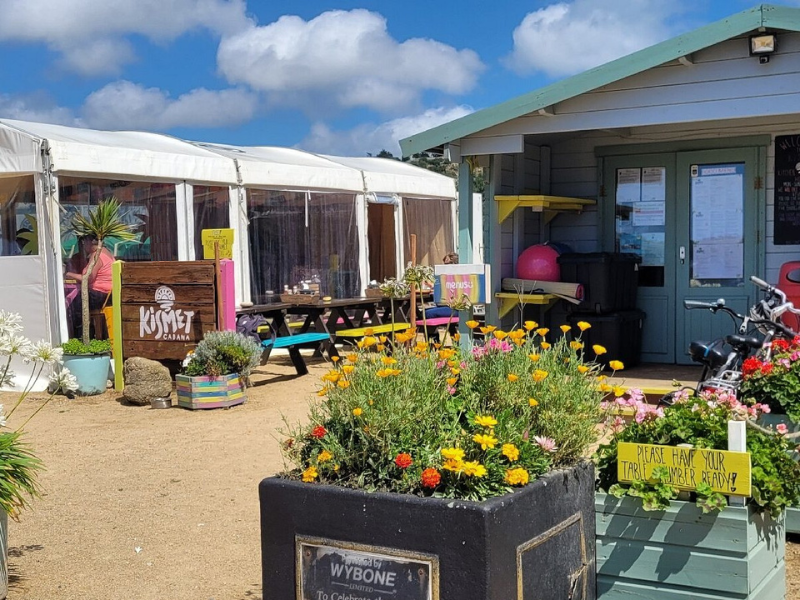 Kismet Cabana is a celebrated beach café and restaurant located directly on Ouaisne Bay, Jersey, offering a unique fusion of beach culture and international street food.